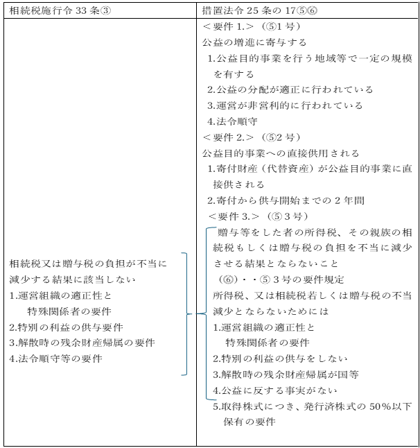 特別の利益供与 | 相続税法施行令33条③ 2号 「当該法人に財産の贈与若しくは遺贈をした者、当該法人の設立者、社員若しくは役員等又はこれらの者の親族等(次項第2号において「贈与者等」という。)に対し、施設の利用、余裕金の運用、解散した場合における財産の帰属、金銭の貸付け、資産の譲渡、給与の支給、役員等の選任その他財産の運用及び事業の運営に関して特別の利益を与えないこと」 | 措置法25条の17⓺ 2号 「その公益法人等に財産の贈与若しくは遺贈をする者、その公益法人等の役員等若しくは社員又はこれらの者の親族等に対し、施設の利用、金銭の貸付け、資産の譲渡、給与の支給、役員等の選任その他財産の運用及び事業の運営に関して特別の利益を与えないこと。」 |